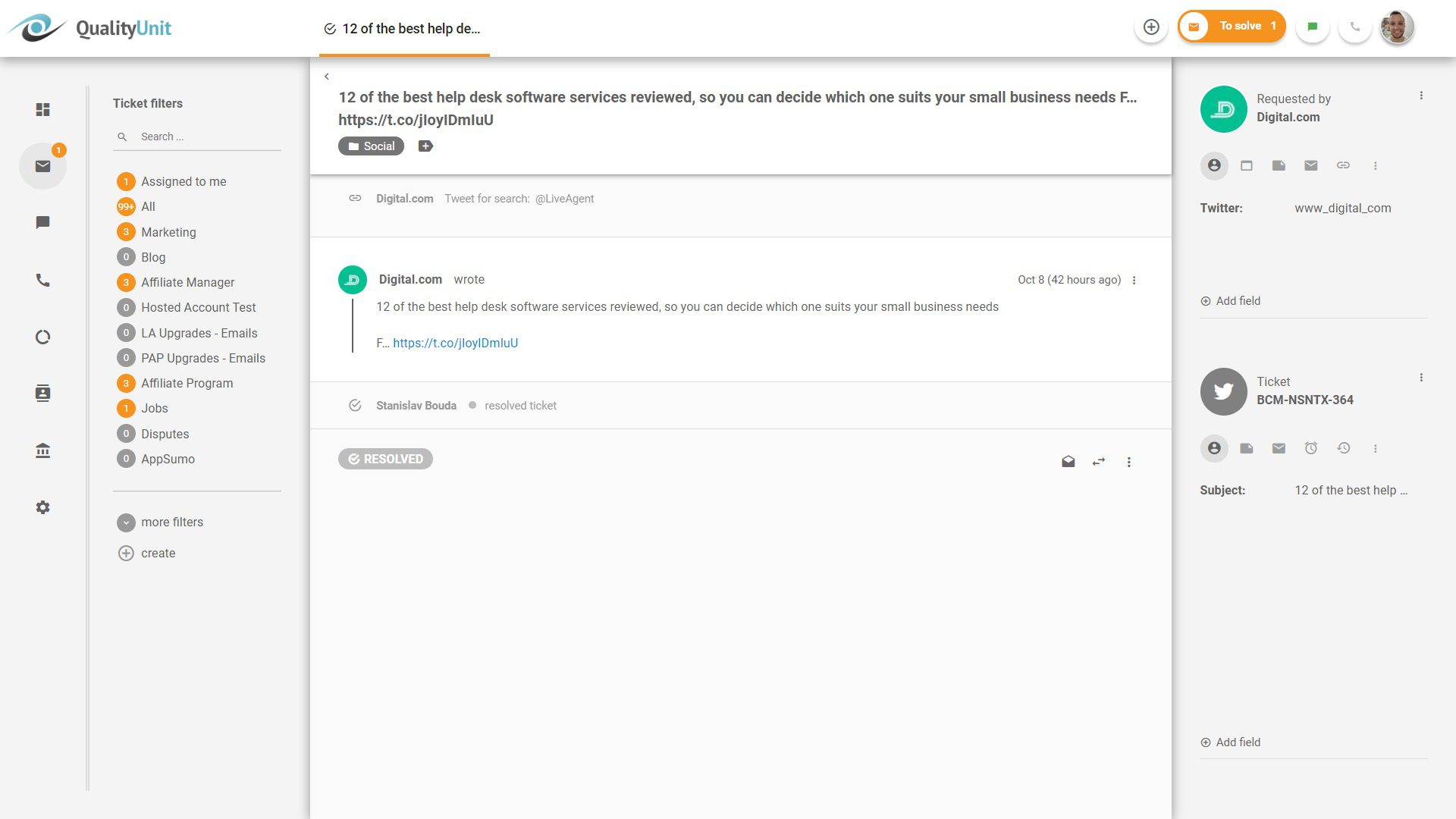 Převezměte kontrolu nad svými sociálními sítěmi pomocí naší alternativy helpdesku pro sociální média. Naše integrované řešení zajistí, že zachytíte každou zprávu, komentář nebo zmínku o vaší firmě, což povede k pozitivnímu vnímání vaší značky, větší spokojenosti zákazníků a vyšším prodejům.