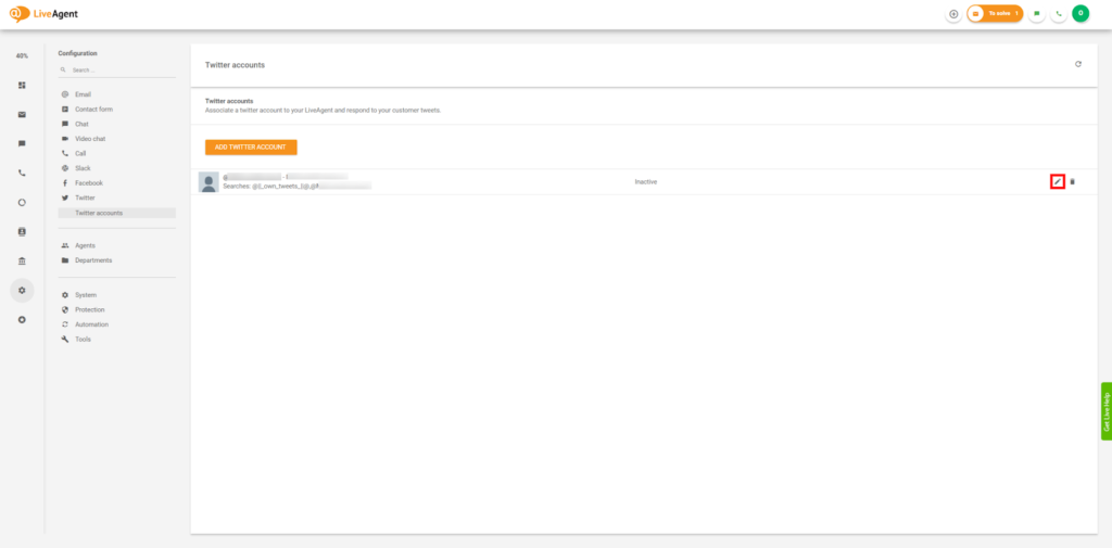 - Jakmile je váš LiveAgent účet propojen s Twitterem, klikněte na Upravit, kde následně aktivujete účet