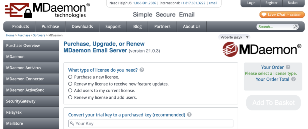 Ještě nemáte MDaemon? Přejděte na webové stránky produktu a začněte. Vyplňte krátký dotazník a získejte plán. Jakmile získáte kód produktu, můžete přejít na stránku s literaturou, kde najdete návody a další zdroje. Až budete s nastavením produktu MDaemon hotovi, přejděte do svého účtu LiveAgent.