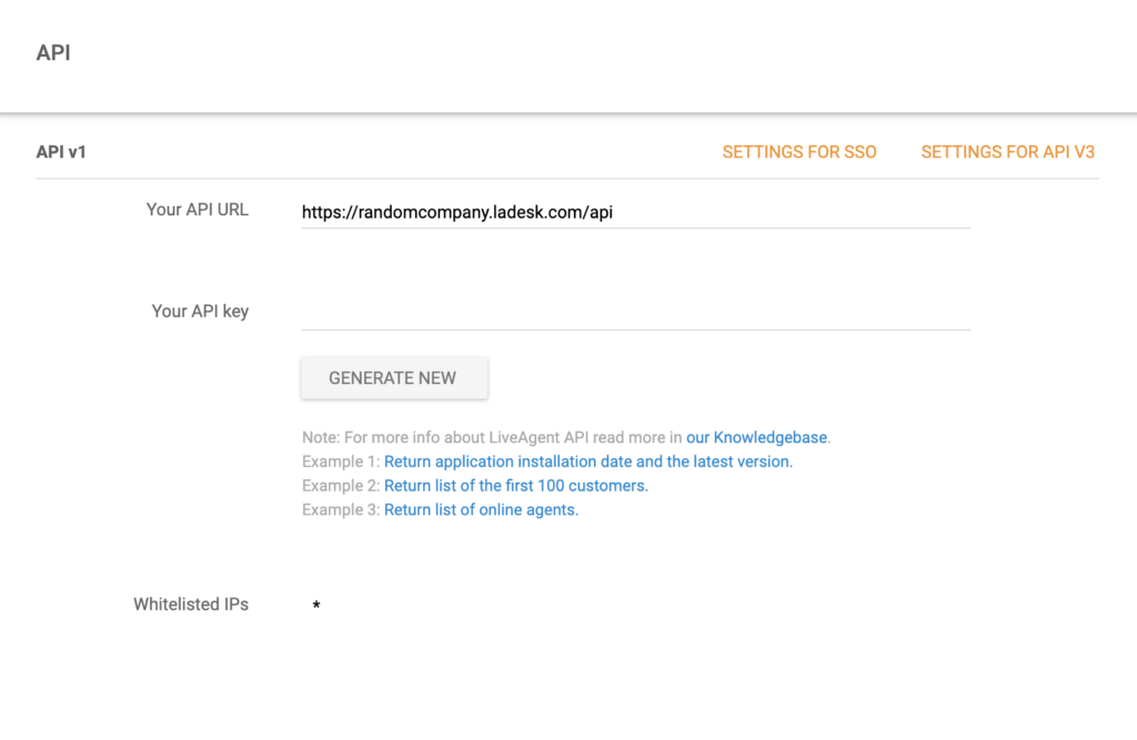- Chcete-li získat klíč API, otevřete aplikaci LiveAgent, přejděte do nabídky Konfigurace > API a v pravém horním rohu vyberte možnost NASTAVENÍ PRO API V1. Vygenerujte klíč, zkopírujte jej a vložte do části konfigurace LiveAgent v aplikaci Post Affiliate Pro.