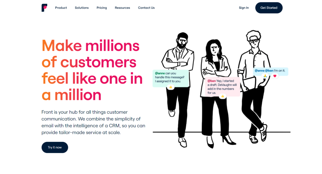 Front je systém pro správu stížností, který pomáhá společnostem sledovat stížnosti zákazníků. Front využívá analytiku k vyhledávání společných problémových oblastí a usnadňuje zákazníkům požádat o pomoc s konkrétními problémy.